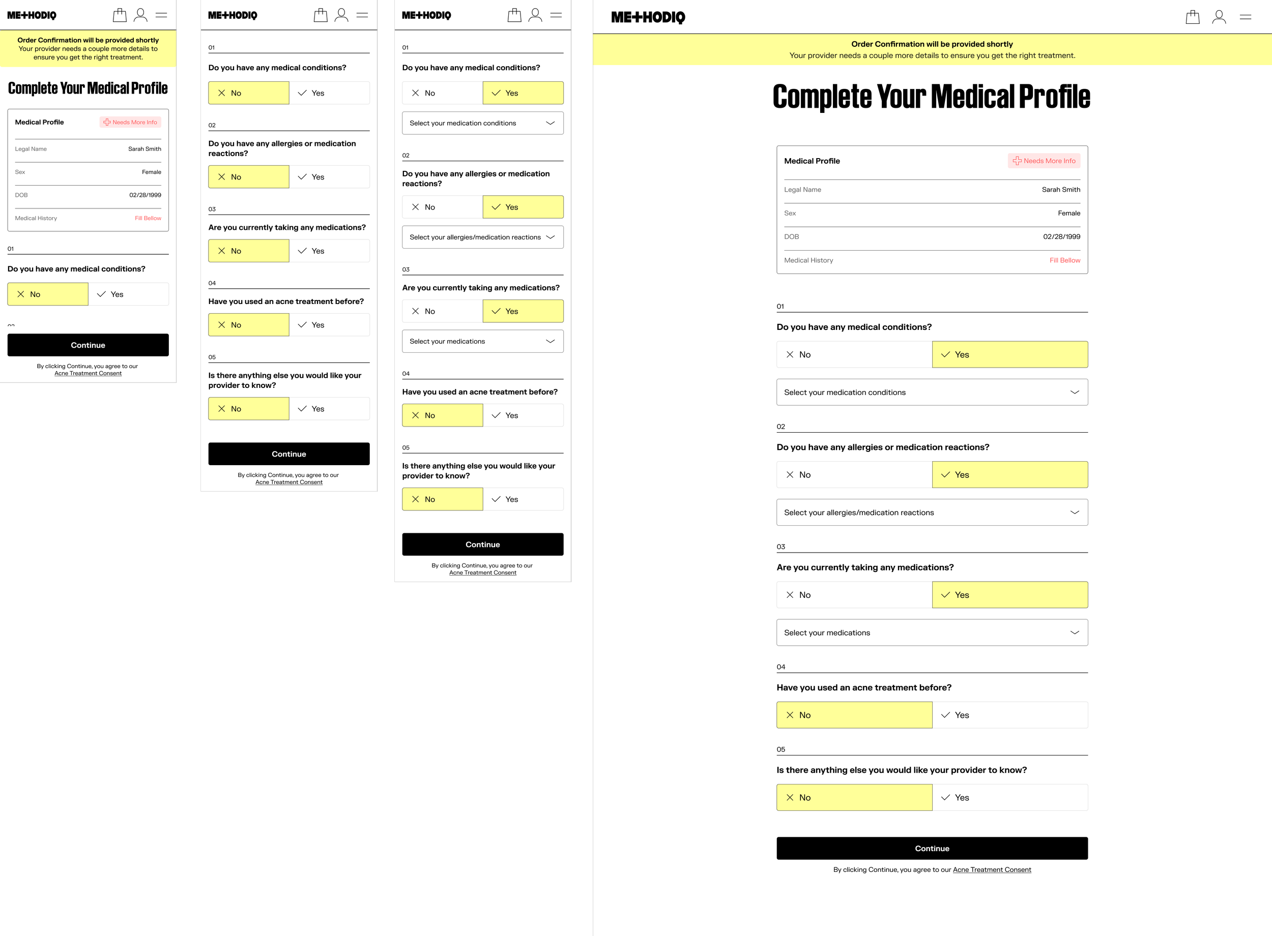 Feature: Rather than your typical Q&A intake flow, our acne patient intake flow allows the user to upload a photo of their skin and see an analysis of their skin with metrics related to their acne condition (acne severity, inflammation scores of lesions, acne locations on face, hyperpigmentation coverage, etc.)
